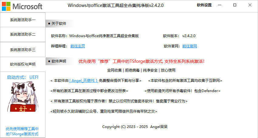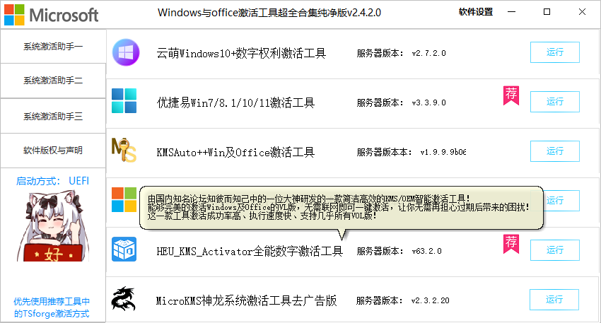 软件包括20多种工具,被网友推荐过好多次的“Activation数字权利激活工具”、“云萌数字权利激活工具”还有“HEU_KMS”,它都有集成在软件中。